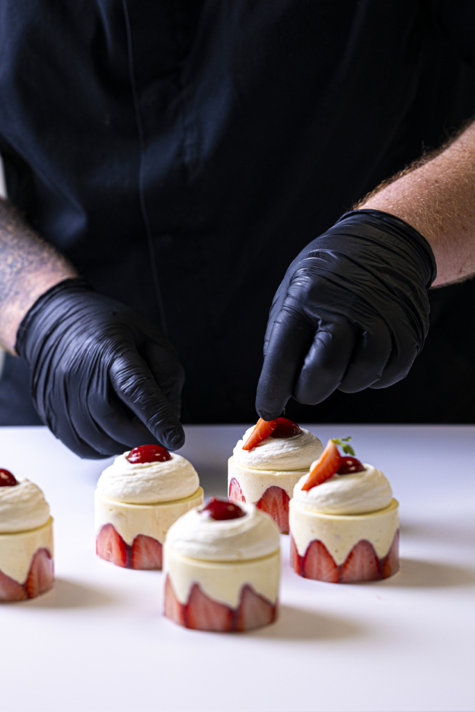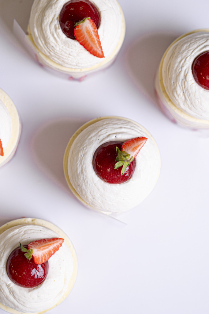 Génoise / crème diplomate vanille / confit fraise / fraise fraîches / ganache montée vanille