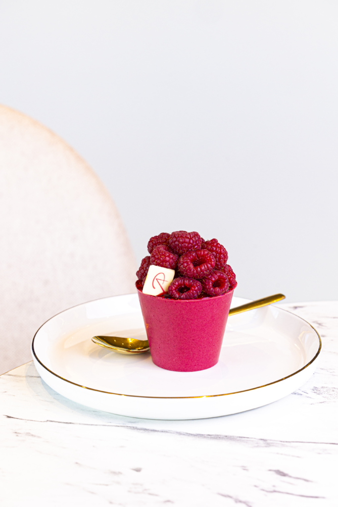 Pot en chocolat framboise / crème diplomate vanille / gel framboise / framboise fraîche