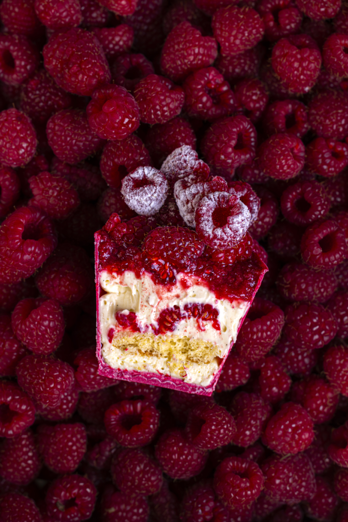 Biscuit génoise/ Diplomate vanille / Gel framboise / Framboises